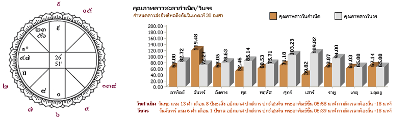 ที่เรือนกัมมะ มีดาวลอย 4 ดวง คือ ดาว 2 , 3 , 5 , 6 ให้พิจารณาดาวที่มีคุณภาพสูงสุดก่อนจาก 4 ดวงที่ลอย นั่นคือ ดาวจันทร์มีระดับ 119.48 ดาวทีเหลืออีก 3 ดวงก็สูงกว่า 58 เล็กน้อย ไม่เด่นเท่าไหร่เมื่อเทียบกับดาวจันทร์ แต่ก็มีอิทธิพลเพราะดาวทั้ง 3 ก็ยังทรงคุณภาพดีอยู่ พยากรณ์ในใจ ว่า การงานจะเกี่ยวข้องกับงานบริการ ซึ่งเด่นเลยทีเดียว(ตามคุณภาพดาวจันทร์) หากพบว่ามีดาวเด่นๆ 2 ดวง ก็พยากรณ์ผสมผสานดาวทั้ง 2 ดวง